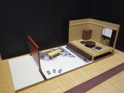 実は日よけ用に大きな和傘を作ってありますが、配置するのかどうか考え中です。あると邪魔になるような気もします。出来そのものはあまりいいものではなくて、ここじゃなくて販売スペースに使ってもいいと思うし、やり方はいろいろあるでしょう。こうして全体を通してみると、和室に生活感がなかったのに、あまり不自然を感じません。塀は道路と庭をつなげるために、適度な長さにしました。門はありませんが、演出上なくてもなんら不都合にはならないでしょう。最終的にはここに浴衣を着た神姫が役者として6名配置されることを考えれば、空間の作り方は十分だと思います。