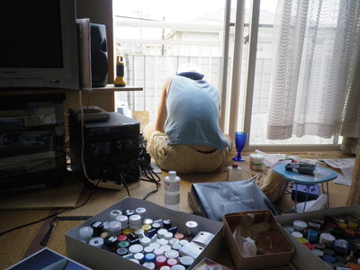 塗装するときはこのようにベランダでやりますが、私はたいてい何でも床に座ってやります。いすと机を使うのは絵を描くときだけ、それ以外は何やるでも床に座って作業ですね。あ、あとPCも専用机使っているか。今日は作業量が多すぎて、もう思い出したくないですわに。明日へたばったりして。
