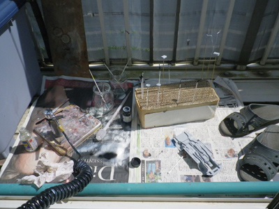 なーんか、塗装している姿ってのは哀愁がありますな。道具はすべて決められた箱に収納されていて、塗装のたびにこうして引っ張り出してくるのです。今日みたいに日当たりの強い日は、帽子必須であります。