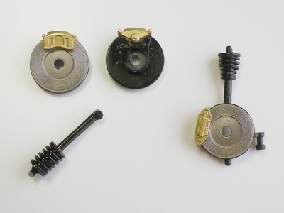 ブレーキ周りは後輪部の接続がかなりいい加減なため、サスを一部切り落とし、ダンパーとディスクを別パーツ化して接続を変えます。写真右は前ブレーキで、この部品は一部を切り落としてそのまま使います。大変なのはやはり塗りわけ。